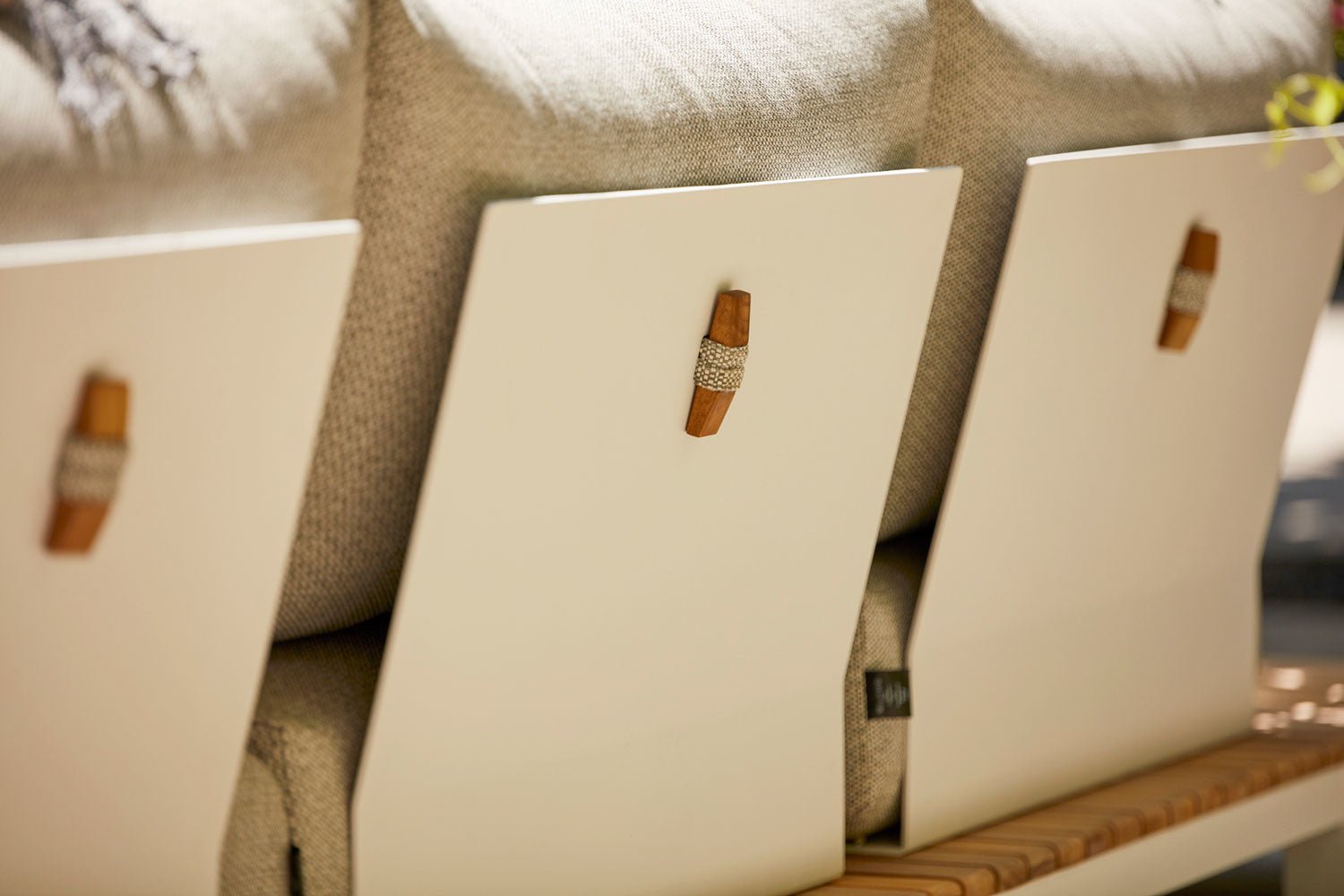 De Portofino loungeset geeft je het ultieme gevoel van Loungen met de hoofdletter L! Deze loungeset heeft door zijn strakke design en gecertificeerd teakhout een prachtige uitstraling gekregen. De Portofino is groots! Zowel qua omvang als aangezicht. De diepe zit van 64 cm, maakt dat je op deze loungeset lekker je benen kunt optrekken en heerlijk kan loungen. De rugleuningen van de Portofino loungeset zijn gemaakt van mat wit gepoedercoat aluminium. Suns heeft er ook aan gedacht om de rugkussens vast te kunnen zetten. De kussens zijn door middel van een teakhouten “klosje” aan de achterzijde van de rugleuning bevestigd. De mixed weave kussens zijn zeer geschikt voor buiten. Deze stof is namelijk water- en vuilafstotend en heeft een hoge kleurvastheid.
